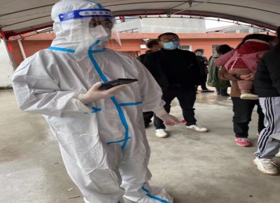 获批准参加外出抗疫后,自3月25日起至今,聪伟每天坚持跟随突击队步行前往石埠镇龙岗村,八点钟之前到达龙岗小学点位,协助开展核酸检测,分发物资、疏导人流、维护秩序,录入信息、引导检测……哪里需要往哪搬,当地村民们顺利的完成核酸检测。虽还未转预备党员,但他以一名正式党员的标准严格要求自己,充分发扬不怕苦不怕累精神,工作中任劳任怨,吃苦在前,从不抱怨,表现突出,上级机关深表认可。由于工作的特殊性,他每天都必须要穿上防护服,这样,“小葱”就实现了变“大白”的梦想。