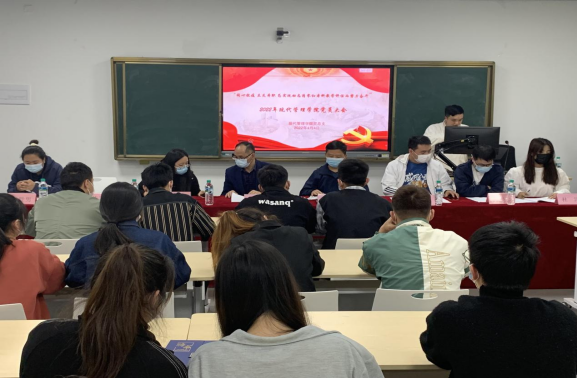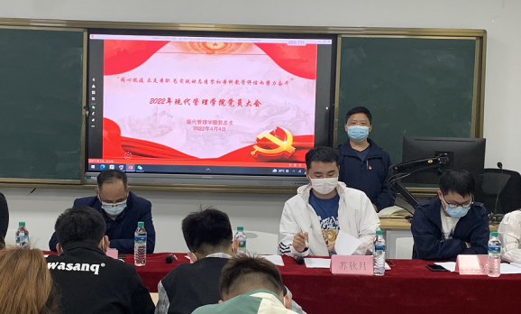 现代管理学院党总支于2022年4月4日在行知楼505多媒体教室召开2022年党员大会。会议主题是“高举习近平新时代中国特色社会主义思想伟大旗帜 同心抗疫 立足本职 为实现动态清零和本科教学合格评估工作而努力奋斗”。会议由党总支宣传委员苏秋月同志主持。会议形式采用的是在校内的党员线下现场参加,校外师生党员以腾讯会议方式线上参加。
