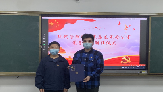 会议第三个议程是为更好地开展党总支党员发展工作,举行聘请现代管理学院党总支办公室第一期学生党务助理仪式。由现代管理学院党总支书记刘国平同志为学生党务助理贾博贺同学颁发聘书。