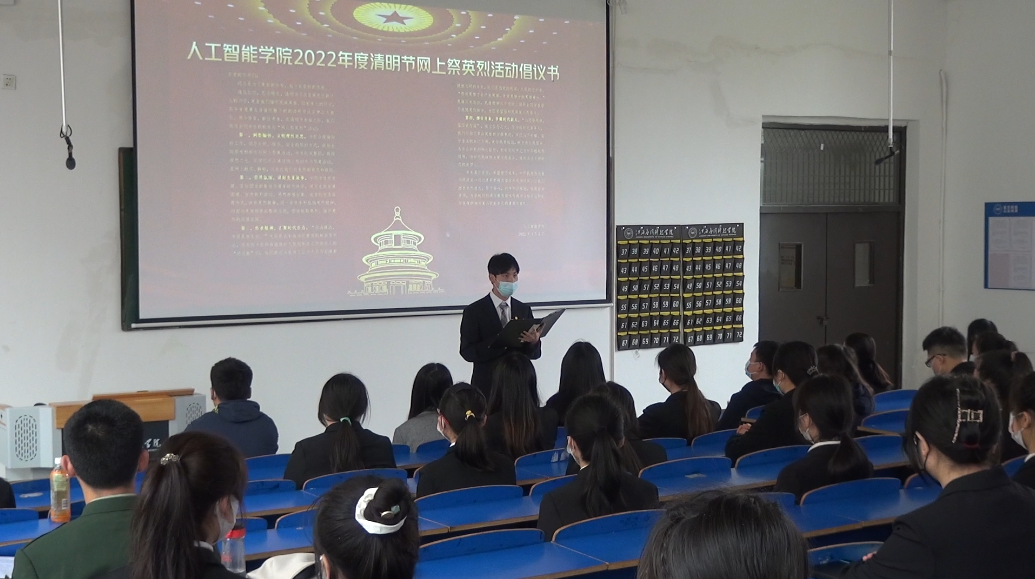 2022年4月5日,人工智能学院2022年“清明祭英烈”主题教育活动在三达楼J8教室举行。学院学工科科长、团总支书记贾鹏军主持。学院党总支书记郑昌保参加,因疫情防控要求,学院部分党员、班团干部代表及辅导员等参加本次活动。