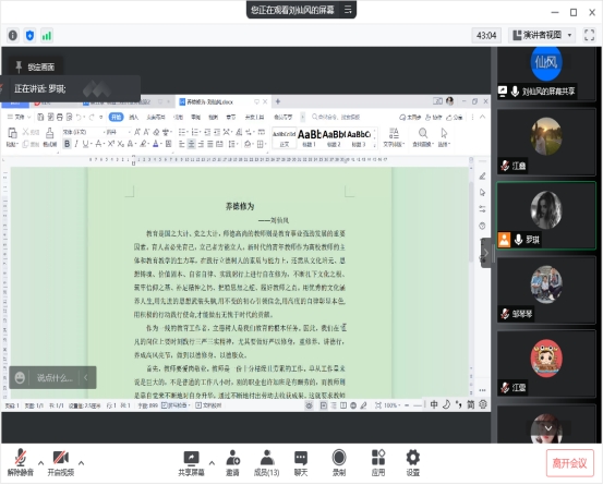 最后是由刘仙风老师对于教师自我师德修养进行分享,刘仙风老师认为作为一线教育工作者,立德树人是我们教育的根本任务。在工作岗位上要时刻践行三严三实精神,尤其要做好严以修身,重修养、讲德行,养成高风亮节,做到修身、以德服众。要爱岗敬业、提高个人修为,真正活到老、教到老、学到老的进取精神,孜孜不倦的吸收新鲜知识来充实自己,以适应时代的发展需要。要在学习,思想,行动上和三严三实精神保持一致。