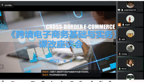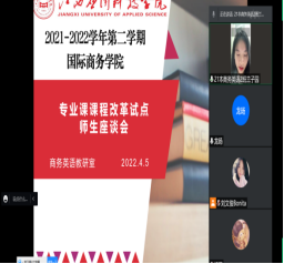 根据《关于成立学校五大质量建设工程-大规模课改工程暨“一师一优”课程建设与改革推进工作领导小组的通知》(应科院教字〔2021〕50号)文件工作预表安排,13日晚上17:00-20:00,《跨境电子商务基础与实务》、《网店美工》、《经济学原理》、《英语语法》、《高级商务英语视听2》5门课程组织了课改试点。由19级国际经济与贸易本科1班学生代表、19级电子商务1.2班学生代表、21本电子商务1班学生代表、19级商务英语1.2.3.4班学生代表就课程教学改革中的收获、想法及建议举行了师生座谈会,本次会议采用线上会议的形式召开。