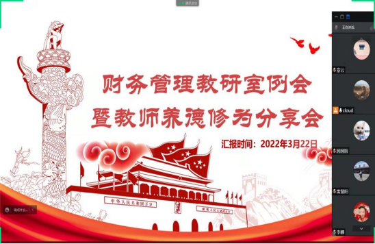 3月22日下午,财经学院教研室在线上开展了2021-2022第二学期的第二次养德修为会议,胡奕凡老师对本学期自我师德修为发表了自己的看法分享了自己的观点。