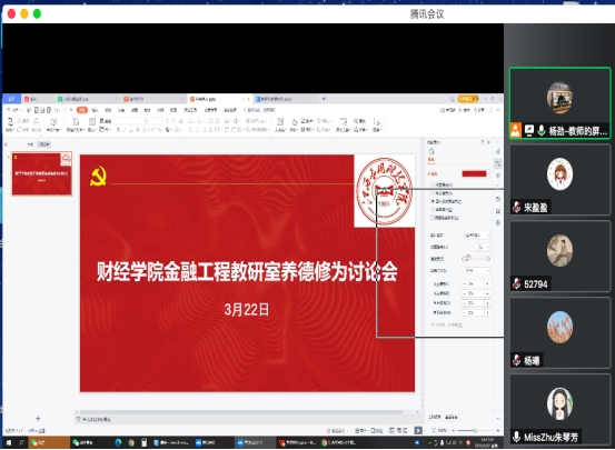 3月23日下午,财经学院金融工程教研室利用腾讯会议,开展了2021-2022第二学期的第三次养德修为会议,各位老师对本学期自我师德修为发表了自己的看法分享了自己的观点。