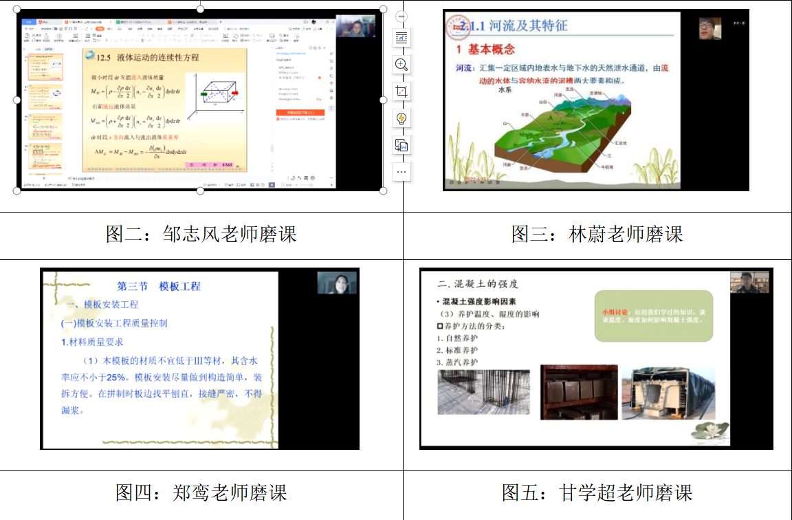 本次课堂教学磨课活动安排了水利水电工程教研室青年教师林蔚(课程:工程水文学)、甘学超(课程:工程材料)、邹志风(课程:水力学)、郑鸾(课程:工程质量与安全管理)等四位老师进行磨课,四位老师根据自己对于日常课程的教学设计以及在上课过程中会涉及到的对学生的安排进行展示,并进行了8-15分钟的在线讲课。