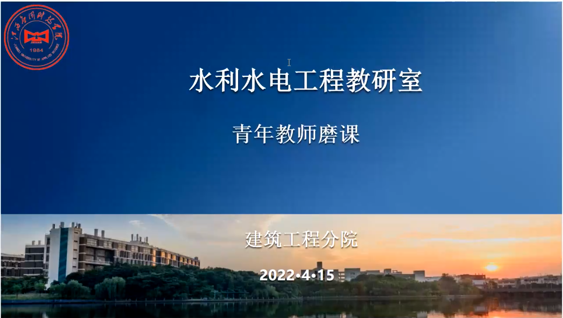 为深化课程教学改革,不断优化教学内容和教学方式,进一步提升教研室教师课堂教学水平,打造“金课”,淘汰“水课”,我院水利水电工程教研室于2022 年4月15日晚组织开展了青年教师“课堂教学磨课”活动。本次活动由水利水电工程专业带头人徐镇凯教授任主评委,教研室负责人林蔚老师主持,学院院长杨志刚、副院长余春泉以及其他教研室老师等参与线上观摩学习。