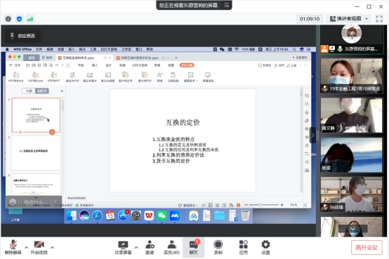 为了进一步提高课堂教学质量,提升教师教学能力,配合教务处“一师一优”课程建设与改革推进工作计划,2022年4月13日上午财经学院金融工程教研室宋盈盈老师在腾讯会议进行金融工程课程公开课展示。学院院长揭志锋、副院长唐衍彬、教务科科长高慧红及科室成员、财务管理教研室主任匡文婷、会计学教研室主任罗琪、金融工程教研室主任杨劲,教务处听课人员、以及财经学院部分老师线上听取了公开课。