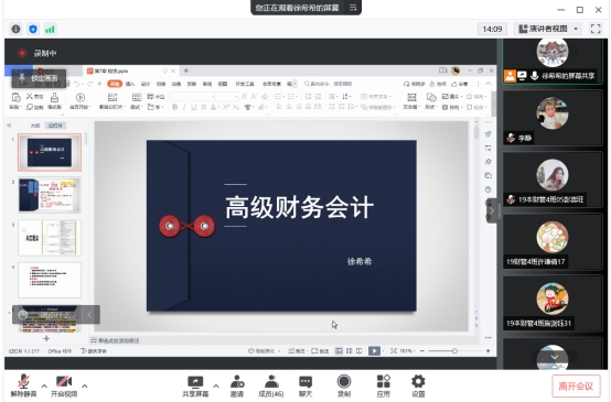 2022年4月12日上午,财经学院在腾讯会议线上举行大规模教学改革系列公开课,此次公开课的课程为“高级财务会计”,由财经学院专职教师徐希希主讲。学院院长揭志锋、副院长唐衍彬、教务科科长高慧红及科室成员、财务管理教研室主任匡文婷、会计学教研室主任罗琪、金融工程教研室主任杨劲,教务处以及财经学院部分老师听取了公开课。