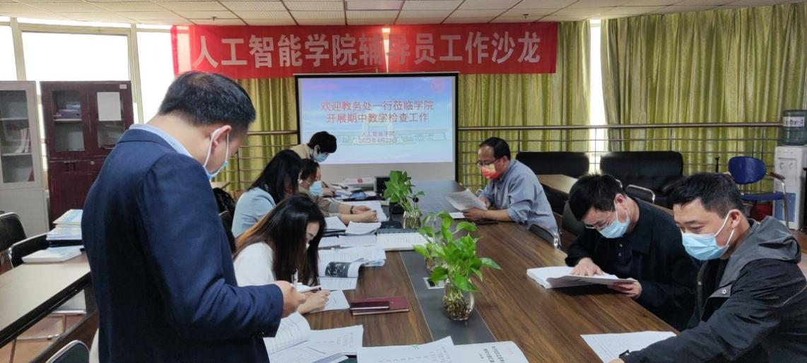 期中教学检查是做好教学质量监控的重要环节,为及时发现和解决教学过程中存在的问题,保证教学各环节良性运行,切实提高教学质量,2022年4月20日上午,教务处副处长魏雅姝、罗玉莲会同质量监控中心等相关老师莅临人工智能学院,对我院开展了2021-2022学年第二学期教学中期检查工作,我院院长李俊、副院长杜鸿、教学实践科科长马启科、副科长张召志参加了检查工作。
