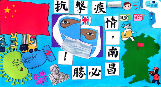 她们首先在中间用超轻粘土粘在硬纸箱上,制作成错位的医护人员防护着的脸庞。其中的眼睛画在素描纸上后剪下来,再用海绵胶粘贴上去,使得其有立体感。这个图像的右上角为超轻粘土制作的红十字图案。医护人员的嘴巴上戴了真实的口罩,表明要戴好口罩,做好疫情防护。周围的“抗撃疫情,南昌必勝!”字样,为书法创作。左下角的拳头象征医护人员奋力抗击病毒,甘于奉献;左上角的国旗下是用马克笔上色的简笔画,显示了各行各业的人员为疫情防护做着各自的努力,运用了平面剪贴技法,寓意着中国抗击疫情必胜!右上角用皱纹纸制作的体温枪,在为旁边的卡通人物测体温,反映了疫情下人们的防护日常。右下角为江西省地图,并标明了南昌市所处位置,围绕江西省地图的左上角和右下角的医护人员与志愿者,展示了非常时期,身负重任,毫不退缩的光辉形象,彰显了抗疫力量!