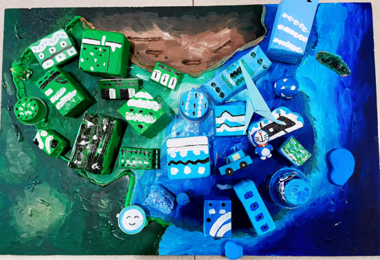 她们首先买回KT板,并在KT板上勾画出完整的中国地图,寓意着中国领土完整,主权不可侵犯。地图整体分为两部分,分别为沿海地区和内陆地区。我们用废弃泡沫盒、纸盒等废弃材料制作高楼大厦等现代化建筑,并用海绵胶细心对应进行粘贴,吸引幼儿的兴趣,让幼儿对祖国的领土有更深的认识。作品还运用了不同形状的建筑物材料,代表着每一个地区的建筑差异,展现不同地区的风貌。
