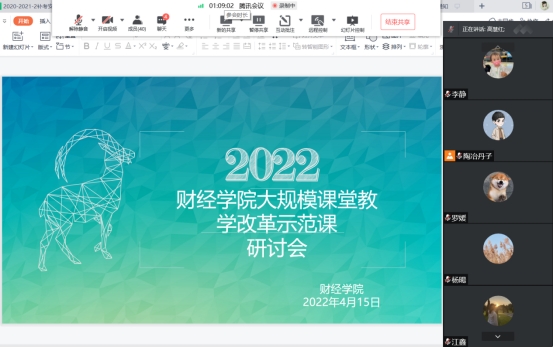 为加强本科教学过程管理,促进教风、学风建设,助推财经学院三大专业课程建设工程,积极推动教师承担起“课程质量”主体责任,充分发挥课堂教学育人的主阵地作用,财经学院在第八周开展了四场大规模课改教师公开课听课工作,分别是徐希希、宋盈盈、唐衍彬、胡奕凡4位老师进行大规模课堂教学改革示范课。针对此次大规模课改工程暨“一师一优”课程建设活动,在2022年4月15日晚上,学院院长揭志锋、副院长唐衍彬、教务科科长高慧红及科室成员、各教研室主任以及学院教师开展线上课程改革示范课教学研讨活动。