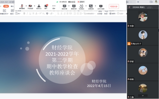 为进一步贯彻落实学校期中教学检查精神要求,更好地了解和掌握教师的教学情况和学生的学习情况,我院于2022年4月15日晚上在腾讯会议召开线上期中检查教师座谈会。学院院长揭志锋、副院长唐衍彬、教务科科长高慧红及科室成员、各教研室主任及专职老师等近40余人参会,会议由教务科科长高慧红主持。