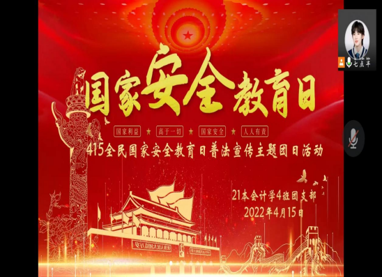 财经学院部分团支部从开始让大家了解为什么要在4月15日设立国家安全教育,各团支部也通过观看视频的方式让财经学院学子知晓4.15是为了提升全社会的国家安全意识,《中华人民共和国国家安全法》将每年4月15日定为全民国家安全教育日。规定,国家加强国家安全新闻宣传和舆论引导。通过多种形式开展国家安全宣传教育活动,将国家安全教育纳入国民教育体系和公务员教育培训体系,增强全民国家安全意识。