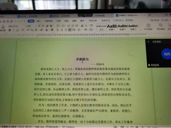 围绕学校高水平应用型大学建设目标任务、主动适应新时代对教师队伍建设的新要求,落实“立德树人”根本任务,2022年4月6日下午,财经学院会计教研室开展了2021-2022第二学期的养德修为分享会议。疫情管控期间,此次会议在线上召开。刘仙风老师进行了养德修为的分享。