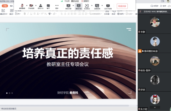 为加强教学基层组织建设,充分发挥教研室在教学、科研、师资队伍建设等方面的积极作用,4月25日晚上,我院在腾讯会议召开了线上教研室主任工作会。院长揭志锋、副院长唐衍彬、教务科科长高慧红、副科长李静及科室成员,财务管理教研室主任匡文婷、会计学教研室副主任罗琪、金融工程教研室副主任杨劲、综合实训副主任崔立全参加。教务科科长高慧红主持会议。