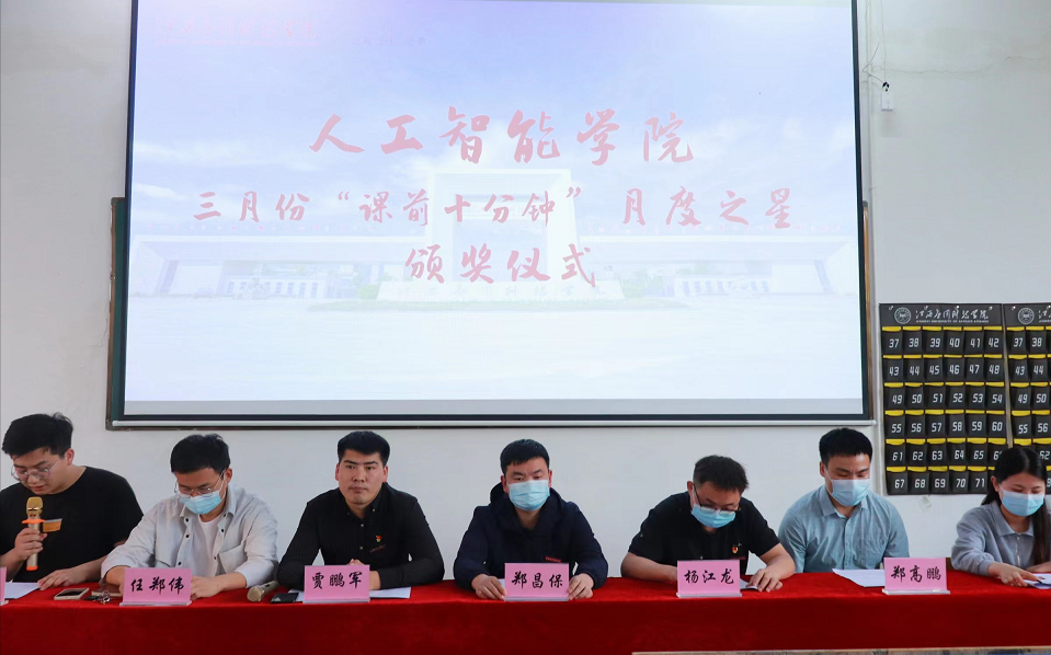 为促进学院学风建设,营造浓厚的校园文化学习氛围,为同学们提供充分展示自我的平台,同时使学院的“课前十分钟”演讲活动走向严格化、制度化、规范化,5月4日,人工智能学院在三达楼J8教室举行2021年三月份“课前十分钟”演讲活动总结表彰会。党总支书记、副院长郑昌保,学工科长、团总支书记贾鹏军,学院全体辅导员参加本次活动。