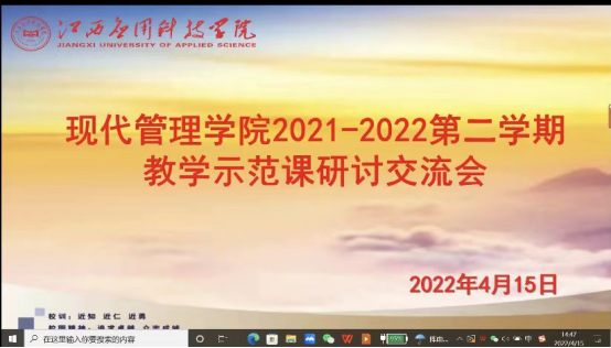 4月15日,我院通过腾讯会议平台组织开展了教学示范课的研讨交流会。学院院长谢远健、教学副院长漆圆方、教务科科长周蓉、副科长黄清以及专职教师们出席了会议。