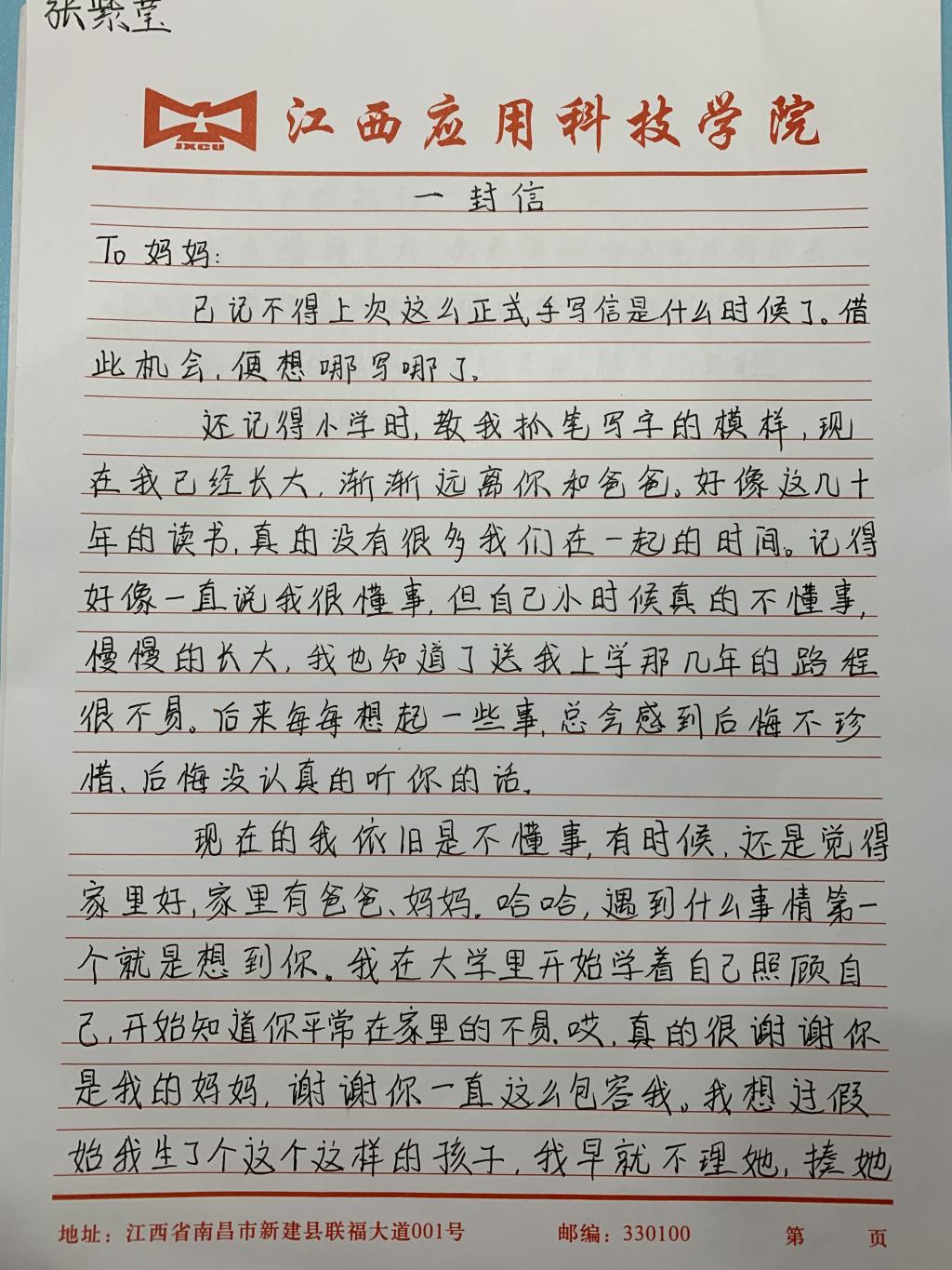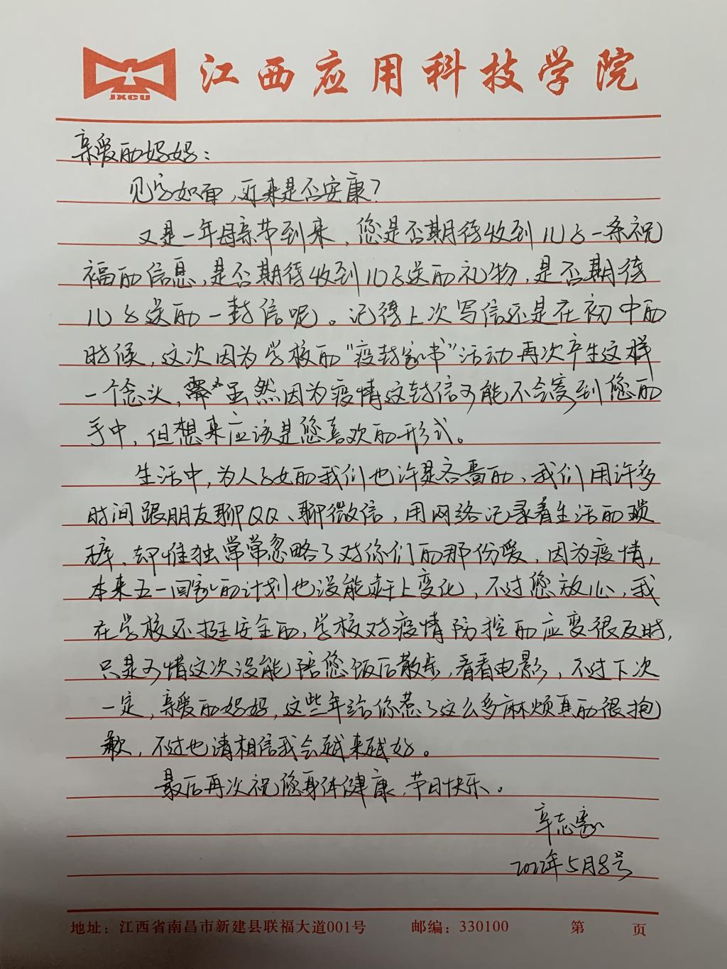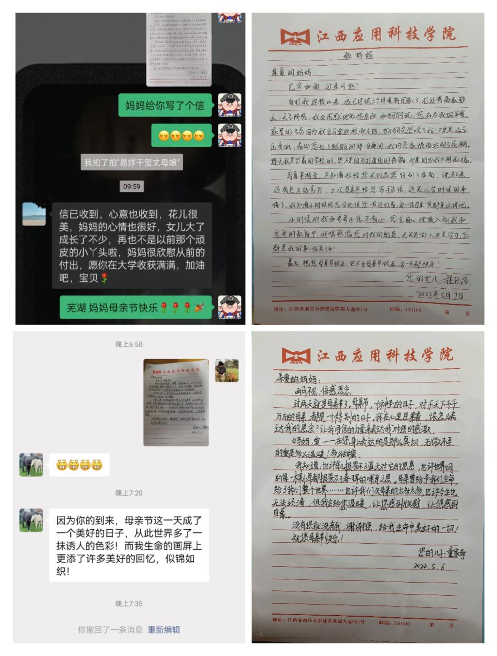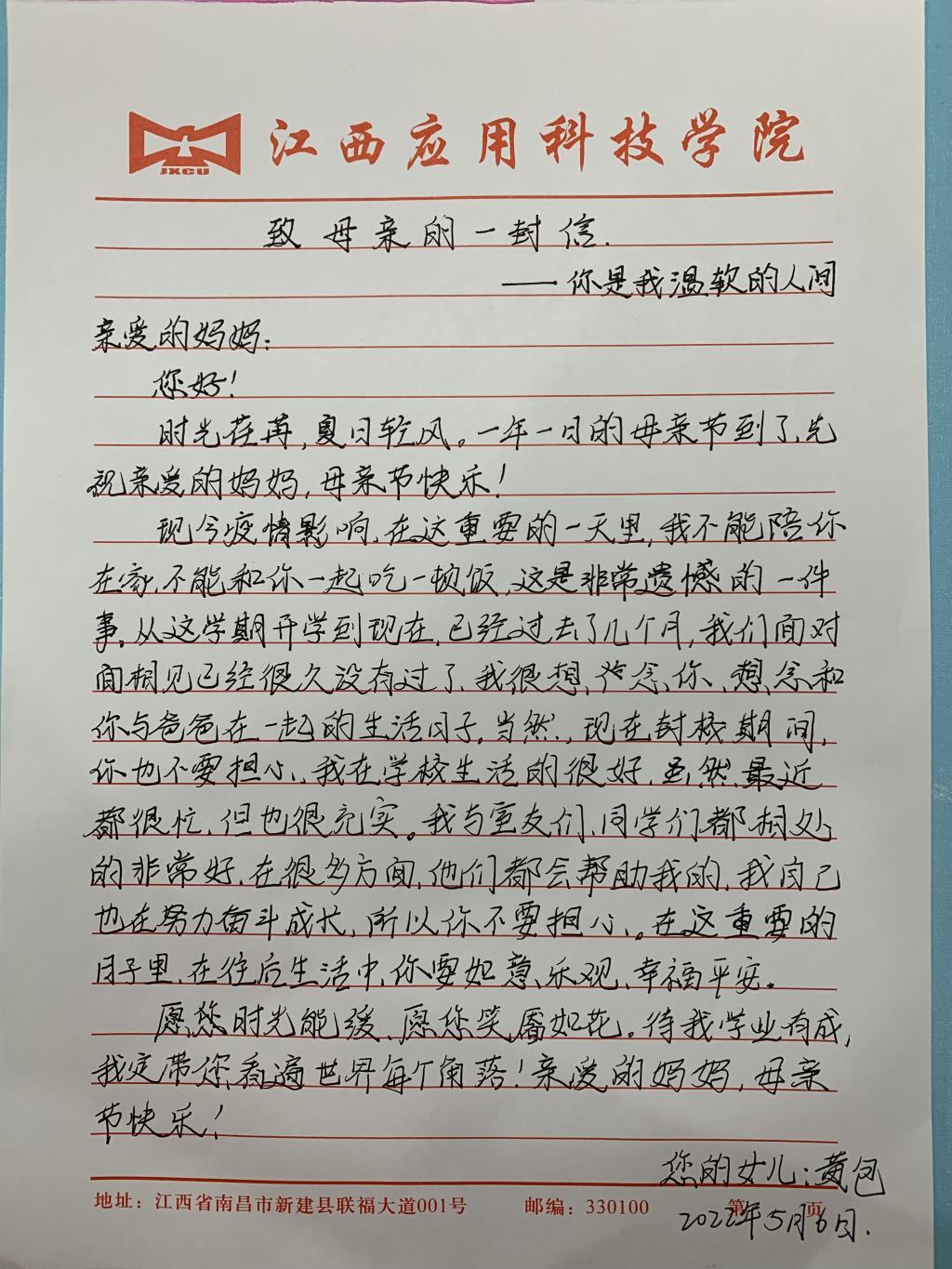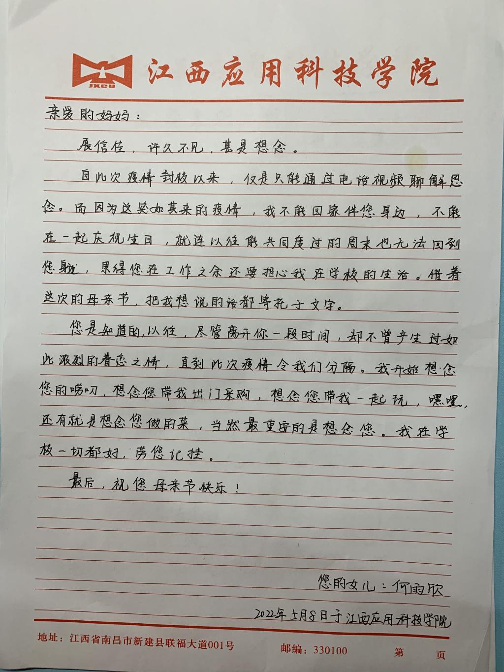 来自20本智能科学与技术1班的何雨欣在给妈妈的信中写道:“您是知道的,以往,尽管离开你一段时间,却不曾产生过如此波烈的眷恋之情,直到此次疲情令我们分隔,我开始想念您的唠叨,想念您带我出门采购,想念您带我一起玩,嘿哩,还有就是想念您做的菜,当然最重要的是想念您......”。一段段回忆,一段段过往都化作了一串串文字,纪念着与母亲的点点滴滴,更承载着对母亲深深的爱意。