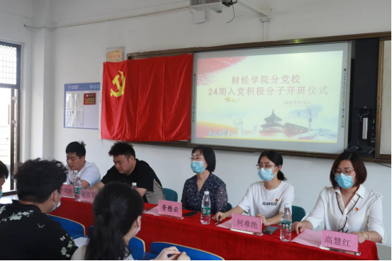 2021年5月6日,财经学院分党校在三达楼415开展24期入党积极分子党课开班仪式。副校长、校党委委员胥懋云;财经学院党总支书记何难绝;财经学院学生支部书记赵贺贺;财经学院教工支部书记高慧红;财经学院全体教师党员、学生党员代表以及财经学院24期入党积极分子培训班全体学员 。