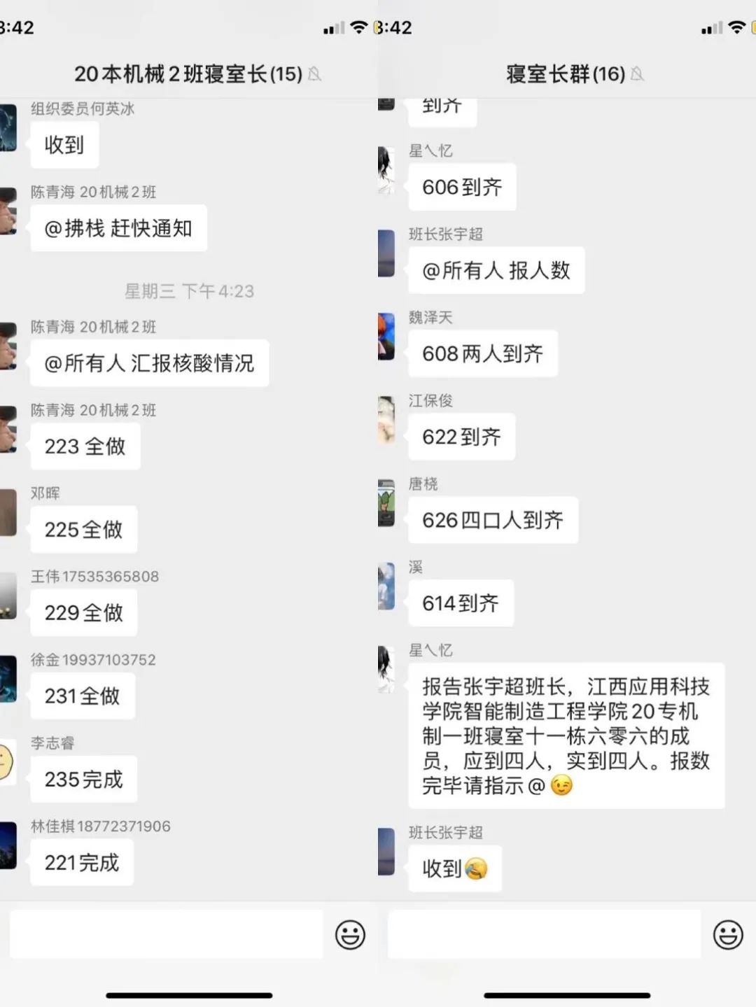 南昌疫情突如其来,学校紧急采取措施及时封校。形式紧迫,为时刻了解学生最新动态,将“网格化+信息化”管理模式融入日常疫情防控工作中,筑牢疫情防控第一道防线。我将所带六个班级分成六个网格块,班长下沉到网格中,充分调动寝室长主观能动作用,建立寝室长“小家长”微信群,通过“小家长”及时了解班级同学的宿舍情况,心理等情况变化。提醒学生们按时核酸检测,每天监督学生健康打卡、体温一日三测等防疫管控措施。