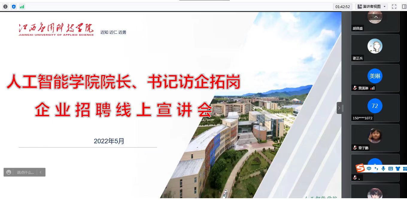 为进一步拓展就业渠道,落实“访企拓岗促就业”专项行动,切实做好疫情期间毕业生就业服务工作,人工智能学院于5月18日开展2022届毕业生访企拓岗促就业线上招聘会。本次招聘会共邀请到6家企业,校就业服务中心主任李军、科长余华珍,学院院长李俊、党总支书记郑昌保、学工科长贾鹏军及毕业班辅导员参加会议,同时200余名学生线上参加了会议。
