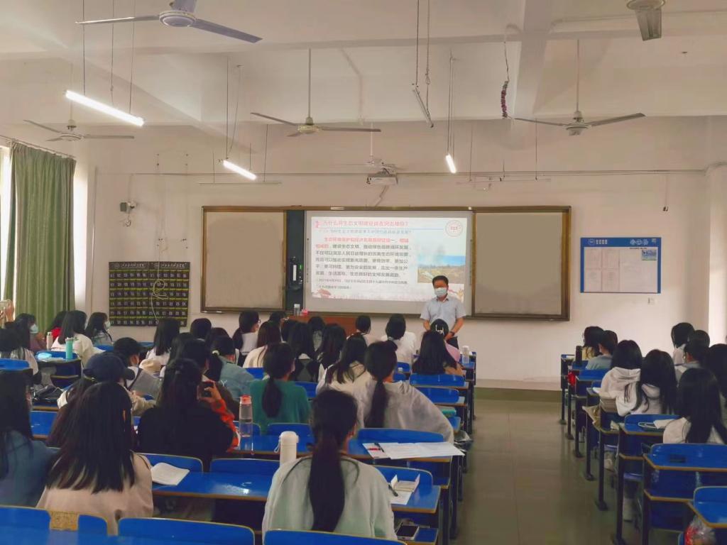 2022年5月20日上午第一节课,在三达楼320教室,关于“为什么将生态文明建设放在突出地位”的学习讨论正持续进行。这是《毛泽东思想和中国特色社会主义理论体系概述》课程的一个内容,刘帅帅老师清脆又富有感染力的话语,引导同学们进一步认知“生态兴则文明兴”的道理。