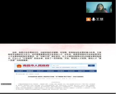 为提升疫情期间就业指导和服务质量,最大限度降低疫情对毕业生工作的影响,确保疫情防控不放松,就业工作不断线,让更多的优秀毕业生留赣就业,我院召开了留赣留昌宣讲会,本次主讲人为国际商务学院院长王慧,我院组织了22届毕业生通过腾讯会议参加。