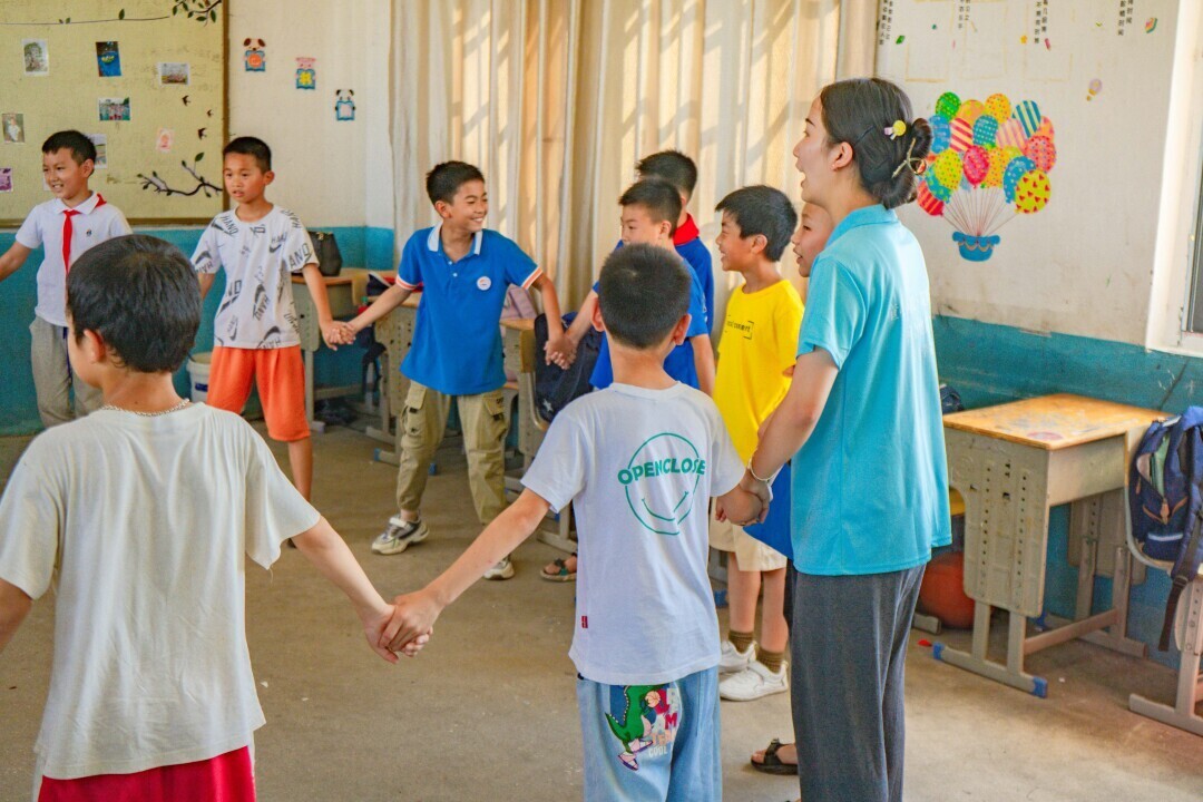 图为实践团成员刘雯带孩子们做游戏。