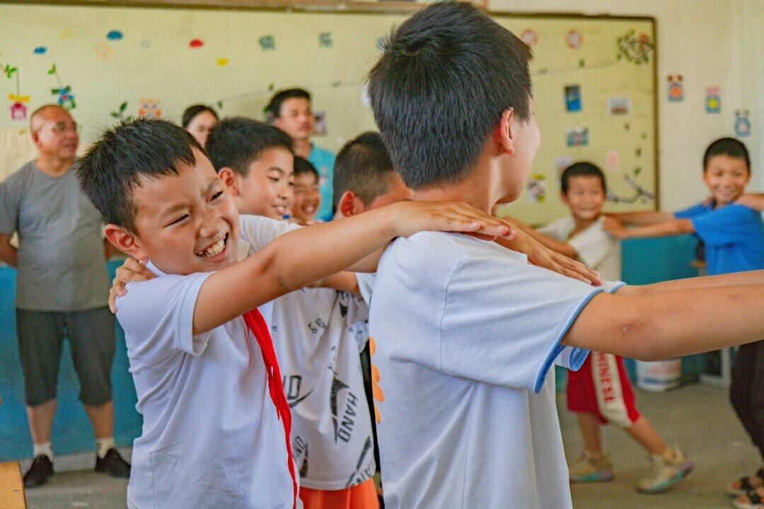 图为孩子们与实践团成员共同跳手势舞。