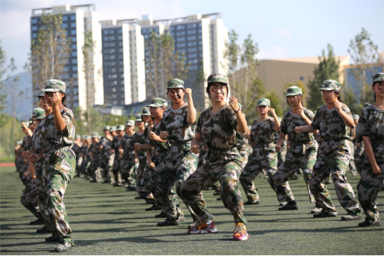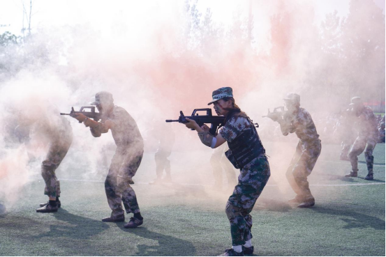 在欢呼、红旗、迷彩、彩烟的围绕下,2023级新生踏着矫健的步伐,排列着整齐的方阵,开始军训汇报展示。分列式的展示显现了新生们的团结一心,勇于拼搏的精神。军体拳的展示,新生们如蛟龙出海,腾挪躲闪,体现新生全面的身体素质。刺杀操展示,双方对垒,硬马硬桥,一招一式全是硬功夫。战术演练展示,模拟烟雾弹让现场扑朔迷离,对阵双方全副伪装迷彩武装,精神抖擞从浓雾中杀出,视觉恍如战争大片,他们帅气的形象引起现场热烈掌声。经过十五天的军训,同学们晒黑了,但是男生飒爽英姿,显男儿本色;女生立凌云志,扬巾帼风采。他们向全体师生展示了他们的全新面貌。