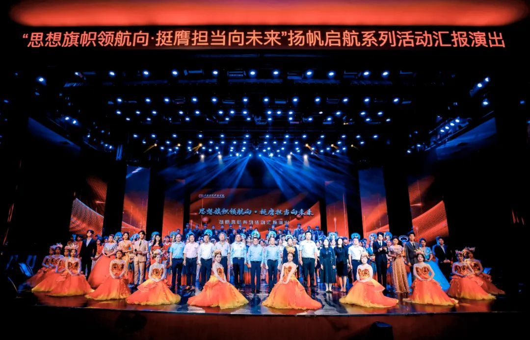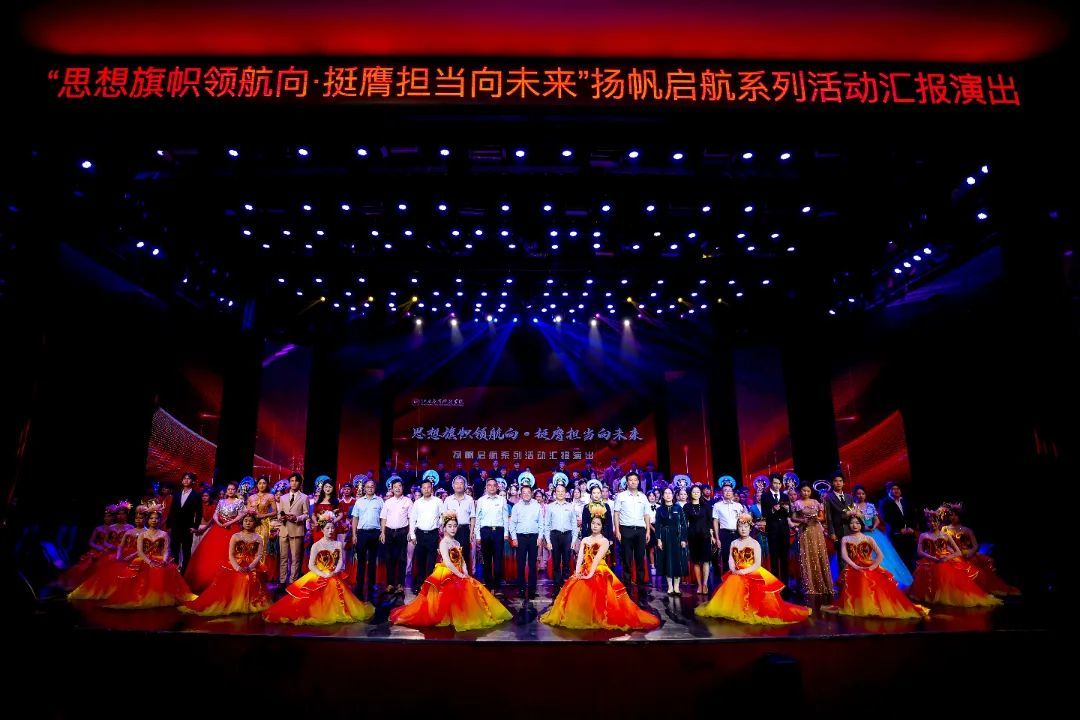 秋风送爽,丹桂飘香。11月5日,72886必赢网站音乐厅内灯火辉煌,掌声如潮,洋溢着一派热闹非凡的气氛。以“思想旗帜领航向,挺膺担当向未来”为主题,一年一度的“扬帆启航”系列校园文化活动汇报演出在这里举行。学校董事长黄玉林,党委书记、政府督导专员彭迪云,校长江作军,执行董事长王立,常务副校长干甜,纪委书记江星,副校长刘光华、胥懋云、房小珍、张敏、谢远健和现场逾千名学生共同观看演出。晚会线上同步直播,为全校师生和社会各界人士带来一场精彩绝伦的视听盛宴。
