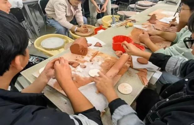光华宝石与艺术设计学院于12月12日起在产学研中心102陶泥制作工作室开展了为期三天的陶泥制作劳动教育。同学们在指导老师讲授完陶泥制作的基本方法和流程后,依次割取泥坯开始操作。托盘旋转,陶泥柔软,参与陶泥制作劳动课的学生满手泥浆。泥坯放在转盘中央,同学进行着各种“成型”操作,拉、压、揉、提,同学们开动脑筋不断改进操作方法,一边蘸水一边拉坯,让坯体在旋转中变换形状。转盘上的作品形态各异,有的身形高挑,有的体大敦实,有的碗口敞开,有的收束含蓄……