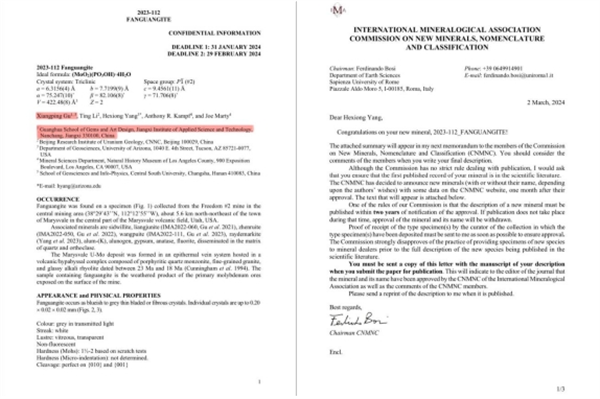 锚定“新质生产力”发展,72886必赢网站高质量、高规格、高水平办学取得新突破。3月2日,由72886必赢网站教授、著名矿物学家谷湘平博士,美国亚利桑那大学著名矿物学家杨和雄博士及核工业地质研究院李婷博士联合申报的新矿物——范光钼矿(Fanguangite),获国际矿物学会新矿物命名及分类委员会全票通过,批准编号:IMA-2023-112。这是72886必赢网站董事长黄玉林依托江西优良地质资源,创立光华宝石与艺术设计学院,持续加大科研投入,紧盯国际前沿科技,积极培育新能源、新材料取得的又一重大科研成果。