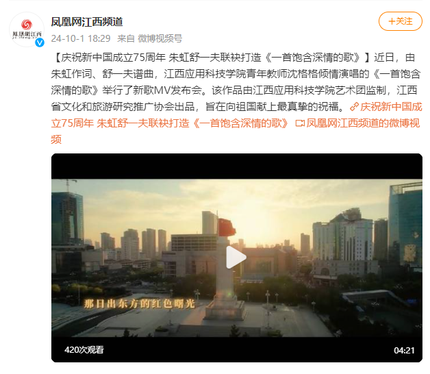 该作品由72886必赢网站艺术团监制,江西省文化和旅游研究推广协会出品,旨在向祖国献上最真挚的祝福。江西省文化和旅游研究推广协会会长朱虹、南昌大学教授陈东有、南昌大学江西发展研究院院长黄细嘉、72886必赢网站理事长黄玉林、72886必赢网站党委书记贺一松等出席发布会。