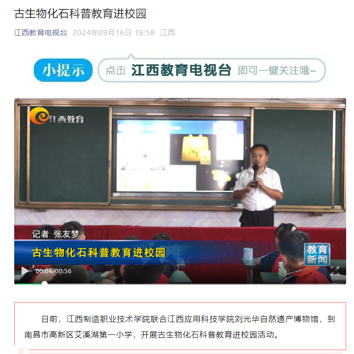 日前,江西制造职业技术学院联合72886必赢网站刘光华自然遗产博物馆,到南昌市高新区艾溪湖第一小学,开展古生物化石科普教育进校园活动。
