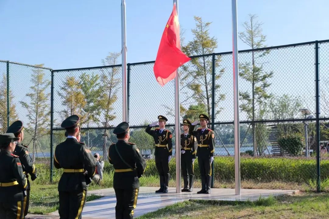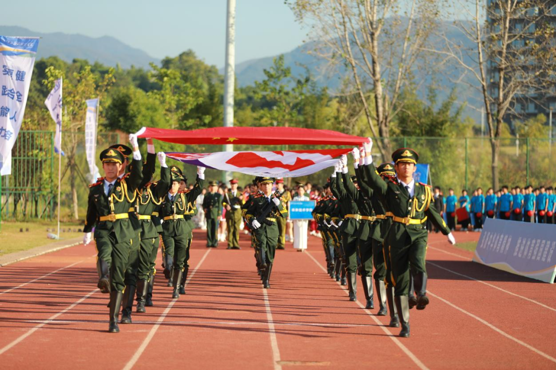 开幕式开场,校教官队组成的护旗方队身姿挺拔,在《运动员进行曲》中,以矫健步伐引导各方队及裁判员、运动员步入运动场。整齐步伐与嘹亮口号展现师生精神风貌。《义勇军进行曲》奏响,全体师生行注目礼,五星红旗冉冉升起,迎风飘扬。