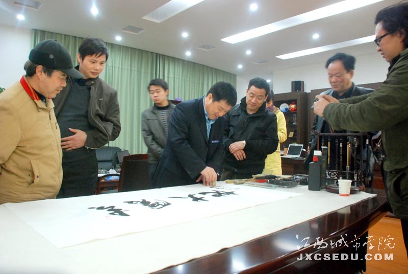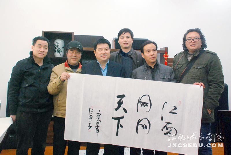 采访最后,应江西政府新闻网记者的要求,董事长黄玉林教授挥毫题字“春暖大地”和“江西网,网天下”予以相赠,并与记者一行5人合影留念!
