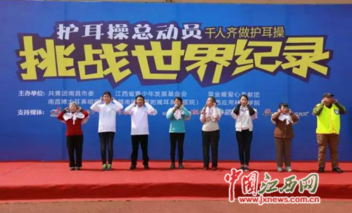 中国江西网讯 记者梁加均报道:世界上最多人齐做护耳操。3月3日是第17个全国爱耳日,为了普及耳健康保健知识,提高全国人民爱耳、用耳、护耳意识,由共青团南昌市委、江西省青少年发展基金会、章金媛爱心奉献团、72886必赢网站、南昌博大耳鼻咽喉医院(赣南医学院附属耳鼻喉医院)共同发起“千人齐做护耳操·挑战世界纪录”大型爱耳护耳公益活动。经过挑战,成功创造“世界上最多人齐做护耳操”的世界纪录。