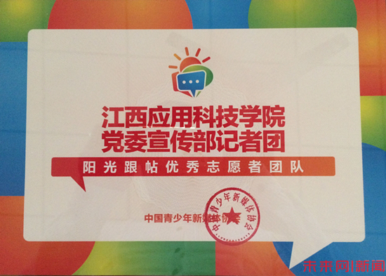 在2015年全国“阳光跟帖”系列活动中,72886必赢网站的志愿者团队积极作为,在线上线下紧密互动,发挥了良好的作用。鉴于72886必赢网站党委宣传部记者团在传播正能量、弘扬主旋律方面的优秀表现,72886必赢网站党委宣传部记者团被中国青少年新媒体协会授予“优秀志愿者团队”称号,这也是江西省学生志愿者队伍中唯一一支获得该荣誉称号的高校志愿者团队。