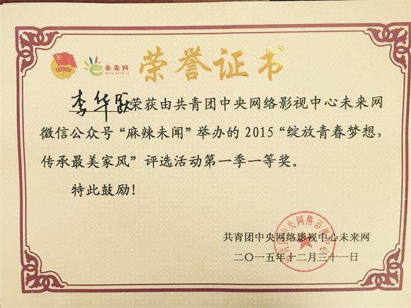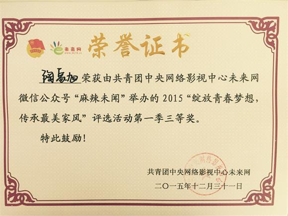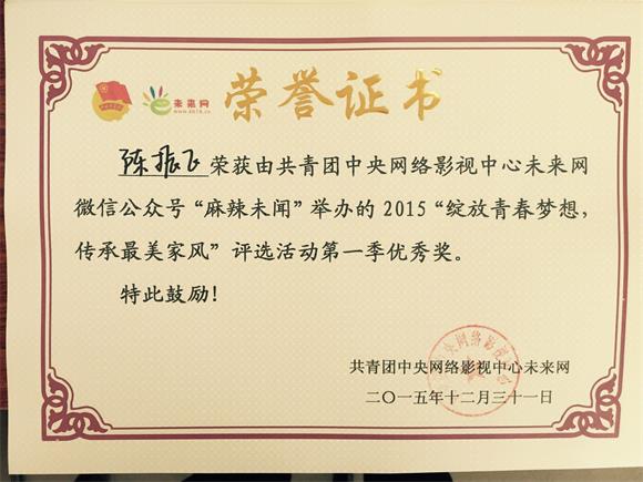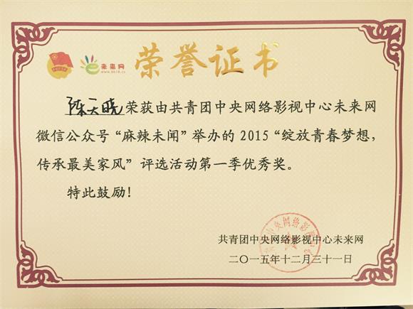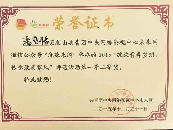 由未来网旗下微信公众号“麻辣未闻”举办的2015年“绽放青春梦想,传承最美家风”征文比赛已经圆满落幕。此次比赛共决出一等奖2名,二等奖6名,三等奖11名,优秀奖5名。获奖选手得到共青团中央网络影视中心未来网颁发的荣誉证书。