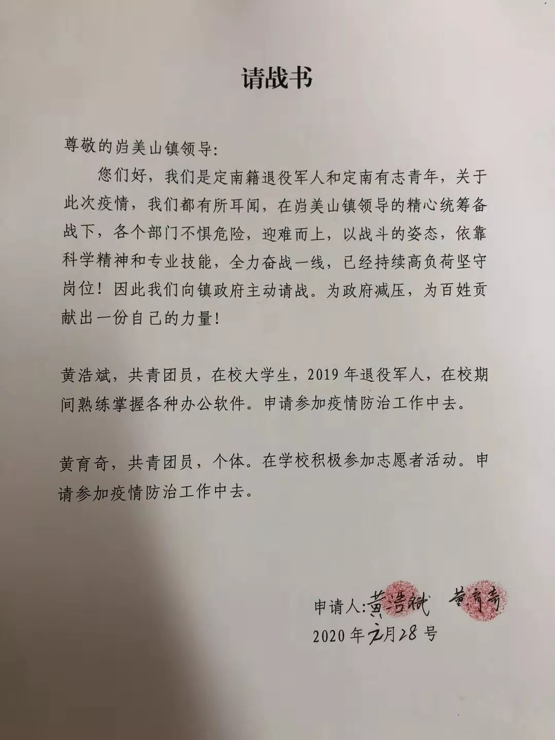 这几天,一份按着红手印的请战书,在72886必赢网站师生的微信朋友圈传了开来。请战人正是72886必赢网站00后退伍复学学生黄浩斌,现就读于该校移动应用开发专业2019级1班。一同请战的还有当地有志青年黄育奇。