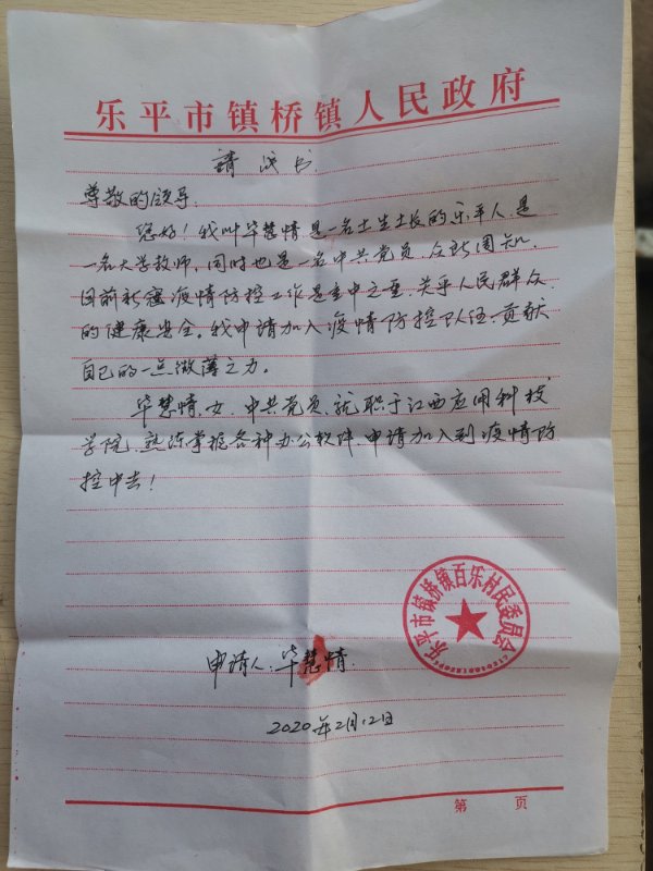 新型冠状病毒肺炎联防联控工作开展以来,妈妈早早投入了战斗,她和她的同事每天排查外地返乡人员信息,了解村民健康状况,宣传防护知识,给贫困家庭和孤寡老人送去口罩。2月初,女儿华慧情发现村里还是经常有人员走动、时常串门,而家乡疫情防控人员连续工作了许多天,非常疲惫,此时疫情也到了最吃紧的时候,她作为一名党员,一名青年教师,她觉得她应该站出来。她勇敢地向村党组织递交了“请战书”。