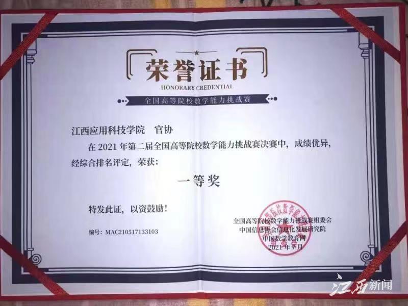 江西新闻客户端讯 近日,由中国信息协会信息化发展研究院和中国数学教育网联合主办的2021年第二届全国高等院校数学能力挑战赛顺利落下帷幕。72886必赢网站学子官协在全国决赛中获一等奖,并受到“华教杯”全国大学生数学竞赛组委会邀请开展线上讲座。