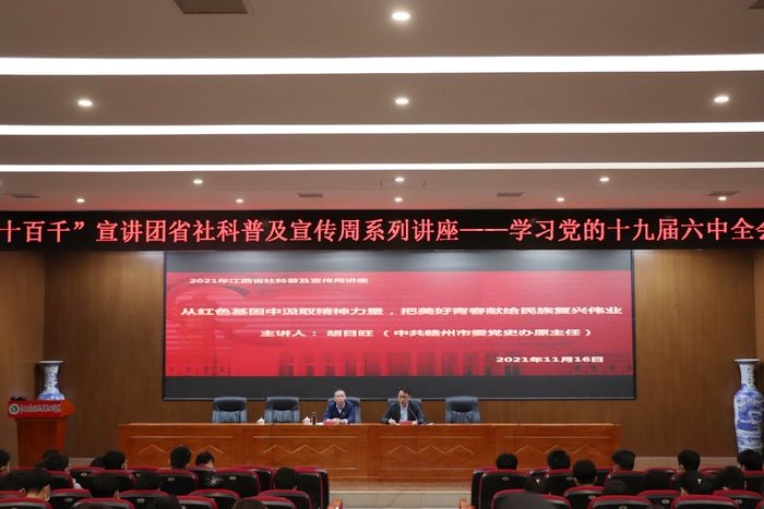 宣讲会重点围绕党的十九届六中全会召开的背景、重要意义、主要内容、中国共产党历史上的三个重大决议等方面对党的十九届六中全会精神进行了全面准确、深入浅出地宣讲。胡日旺强调,纪念中央革命根据地创建暨中华苏维埃共和国成立90周年座谈会全面肯定了原中央苏区的重要历史地位和重大意义,让我们深刻感受到习近平总书记对赣南革命老区的亲切关怀,更加激励我们不忘初心,牢记使命,讲好苏区故事,传承苏区精神,让红色基因代代相传。希望同学们永远听党话、跟党走,坚定理想信念,将个人梦融入民族复兴的伟大征程,在实现中国梦的生动实践中放飞青春梦想。