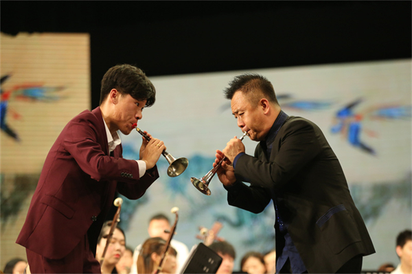 音乐会上,由该校特聘教授、著名唢呐演奏家、国家一级演员牛建党与学生合奏的唢呐曲《百鸟朝凤》技巧华丽,以欢快的旋律演奏百鸟和鸣之声,充分表现了生机勃勃的大自然景象;由该校特聘教授、武警文工团二胡演奏家,国家一级演员王之辉演奏的《战马奔腾》《南湖庆典》以激情满怀的情感与铿锵有力的节奏抒发对祖国的无限热爱与赞美,将全场气氛推向高潮,赢得了观众们的阵阵掌声。