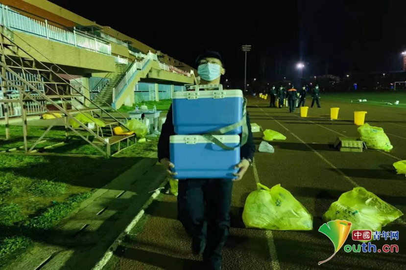 到了正式核酸检测的日子,青年突击队准点集合投入工作,开始布置场地、搬运医疗设备、维持检测现场秩序、并在检测完成后收拾现场,直到凌晨结束。第二天,同样的过程重复来一遍。持续三天的工作中突击队员每天的睡眠时间平均只有3个小时,搬运的物资既有需要五人搬运长7米宽1米的钢架,也有防护服、口罩、消毒液、酒精、检测试剂、橡胶手套、隔离面罩等专业医疗用品。在各项工作中,青年突击队始终冲在一线,并在队长分派任务的时候都抢着去做更苦更累的工作,一天下来,满身灰渍、肩膀淤青、双脚麻木,但心里却异常满足。