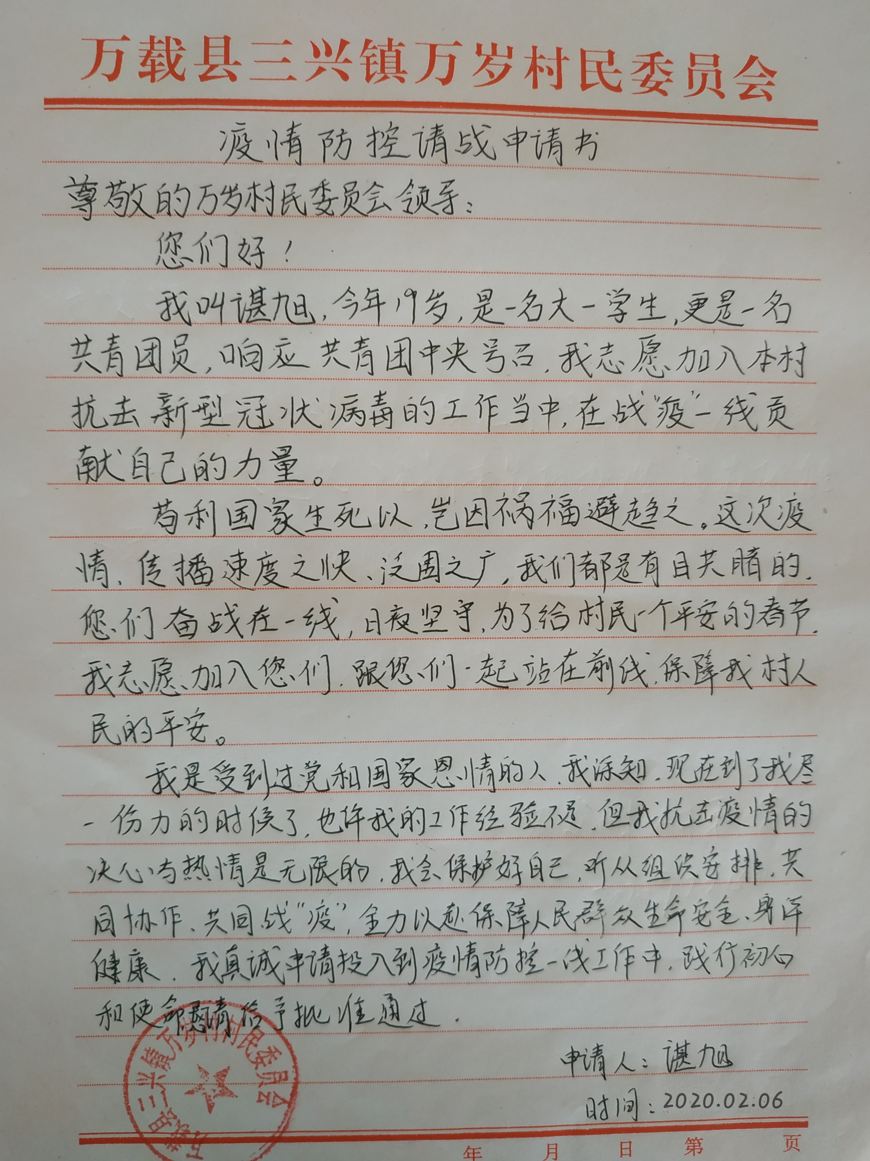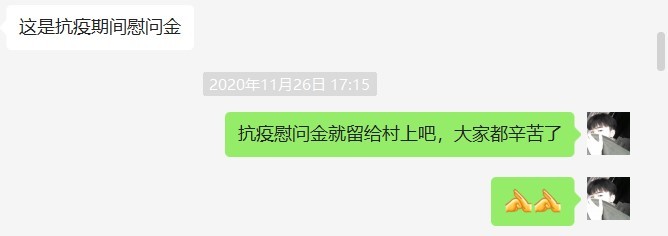 他不计报酬,辛苦付出,一个个日日夜夜坚守在一线。面对村委会工作人员发放的抗疫慰问金,他第一时间便退回了,谌旭说当了志愿者,就要有使命感,要甘于奉献,不应该收取这份慰问金,他要把这份慰问金捐给村委会,用于抗击新冠肺炎,为抗疫斗争奉献自己的一份力量。