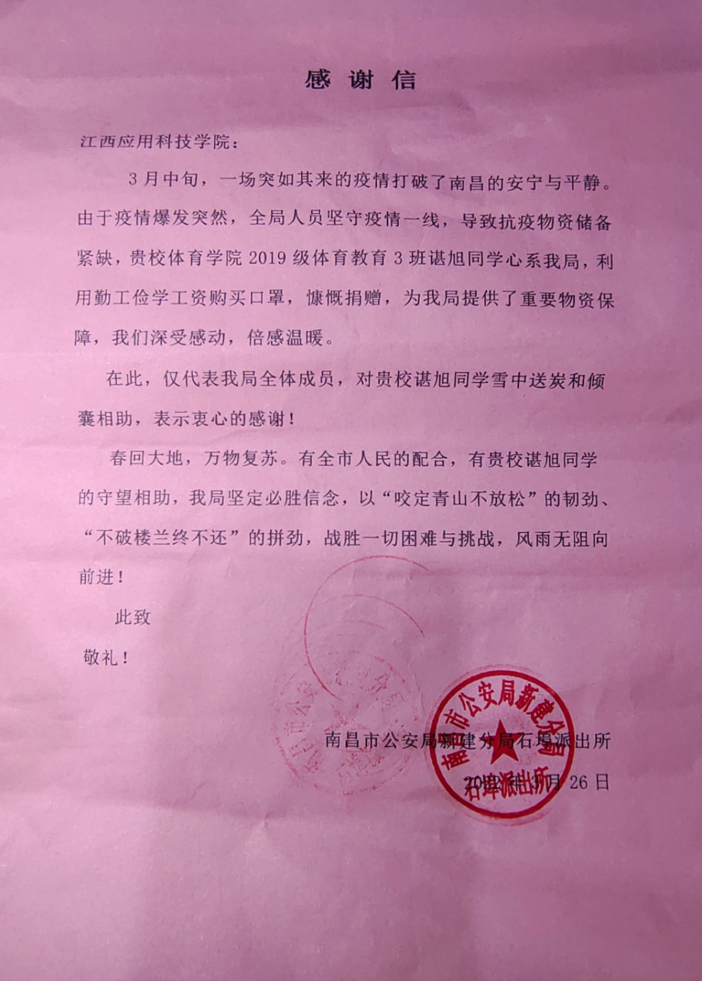 直到3月30日,72886必赢网站收到了一封来自“南昌市公安局新建分局石埠镇派出所”的感谢信,感谢信中说到,由于疫情爆发突然,警员坚守一线,防疫物质储备不足,谌旭同学心系石埠派出所及时捐赠口罩,解决了燃眉之急,信中对体育学院谌旭同学捐赠口罩的行为进行了赞扬与肯定。