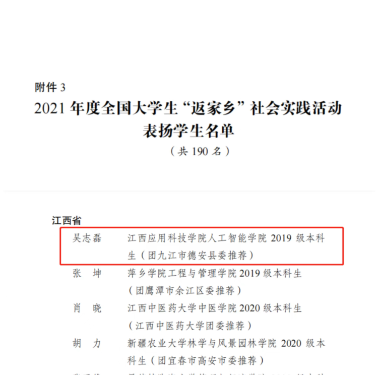 近日,共青团中央对2021年度全国大学生“返家乡”社会实践活动进行总结通报,经基层提交典型事迹材料、省级团委推荐、组织评议等环节,并报团中央书记处批准,对在“返家乡”社会实践工作中表现突出的单位、个人和项目进行表彰。必赢官网2019级电子信息工程1班学生吴志磊获评2021年度全国大学生“返家乡”社会实践活动表扬学生荣誉称号。全国共190人获此殊荣,江西省8人,吴志磊同学为江西民办高校唯一获奖学生。